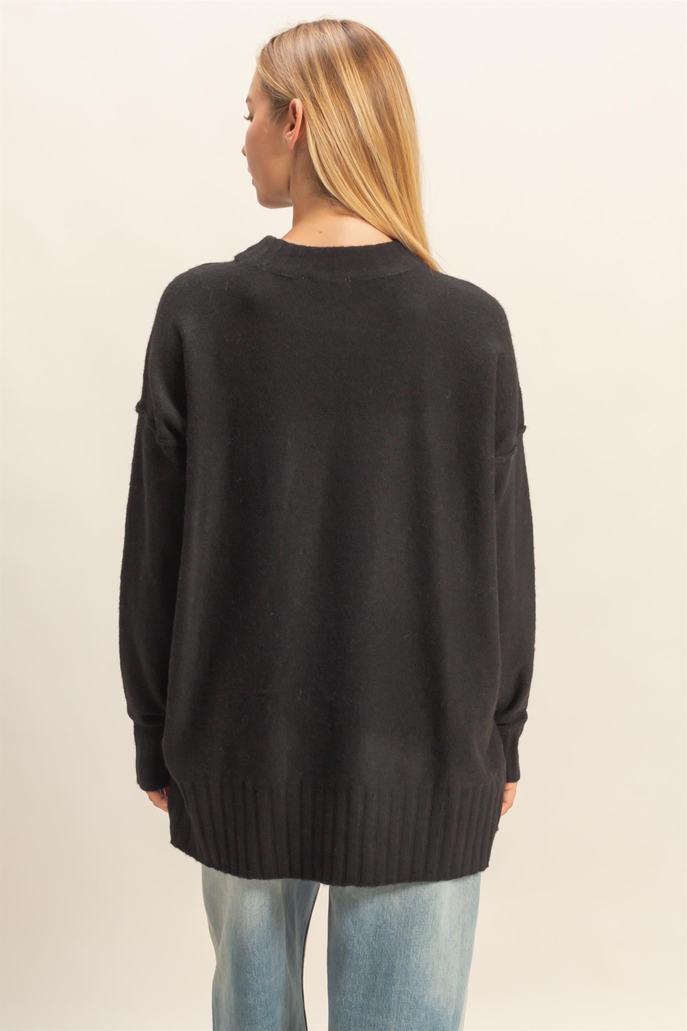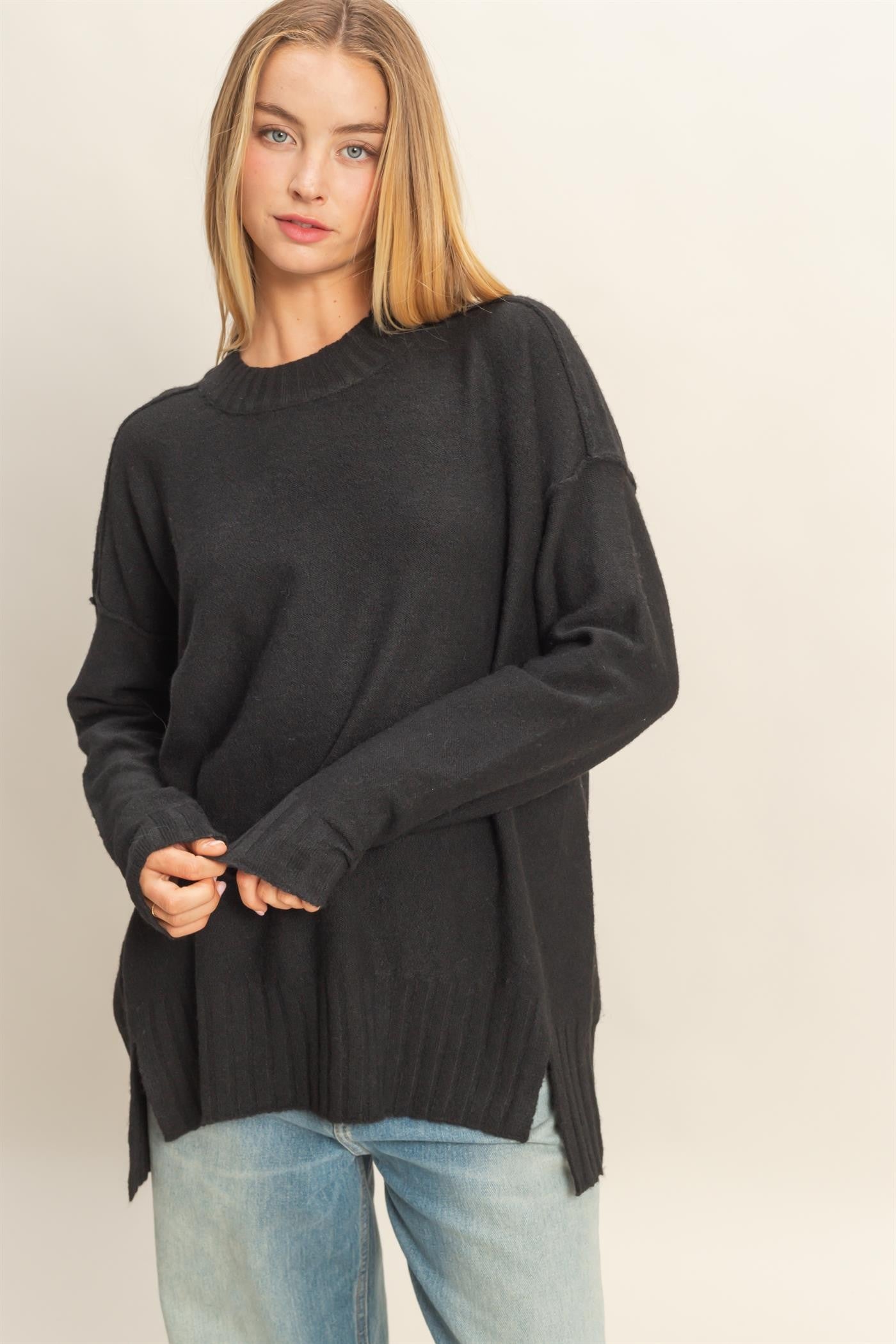 This relaxed fit sweater features a subtle silhouette with front slits. Perfect for layering, this piece pairs effortlessly with jeans or leggings, making it a versatile addition to your wardrobe.