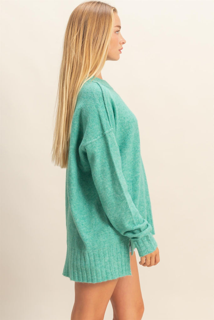 This relaxed fit sweater features a subtle silhouette with front slits. Perfect for layering, this piece pairs effortlessly with jeans or leggings, making it a versatile addition to your wardrobe.