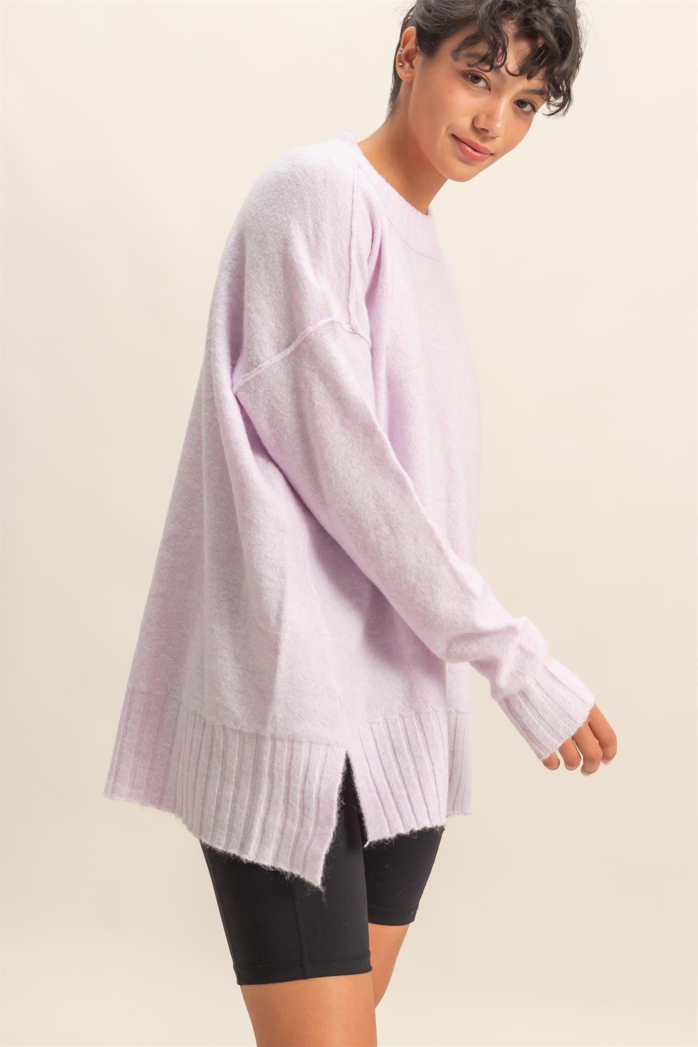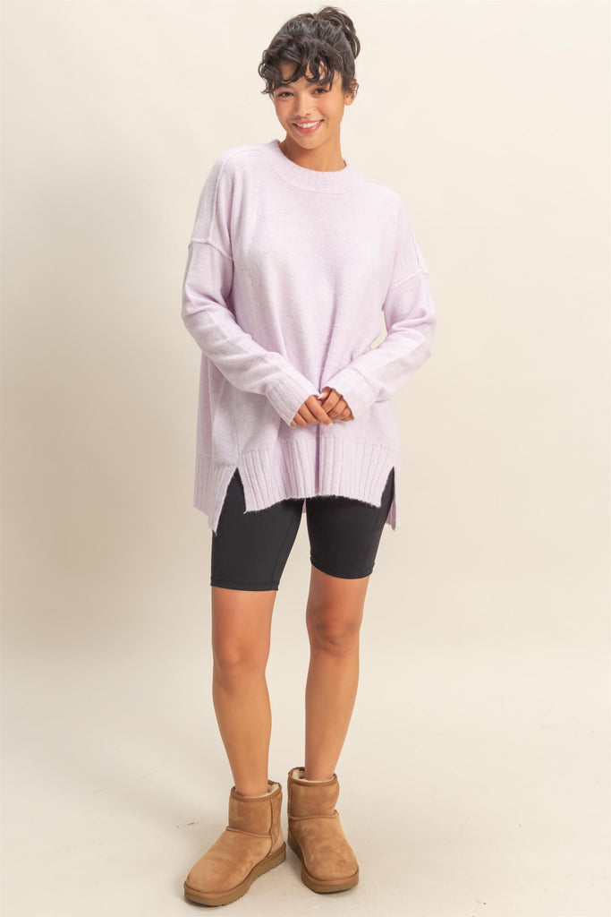 This relaxed fit sweater features a subtle silhouette with front slits. Perfect for layering, this piece pairs effortlessly with jeans or leggings, making it a versatile addition to your wardrobe.