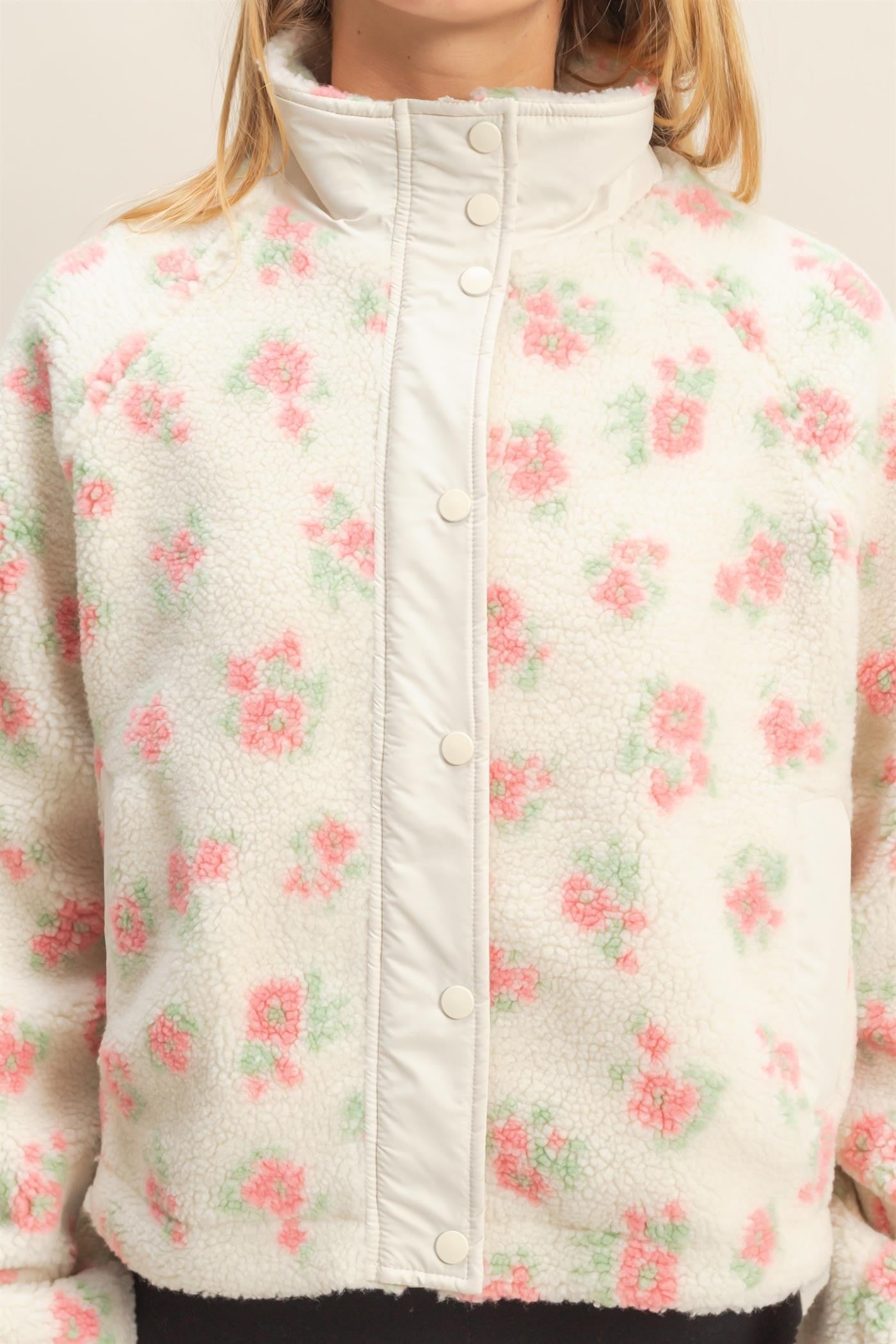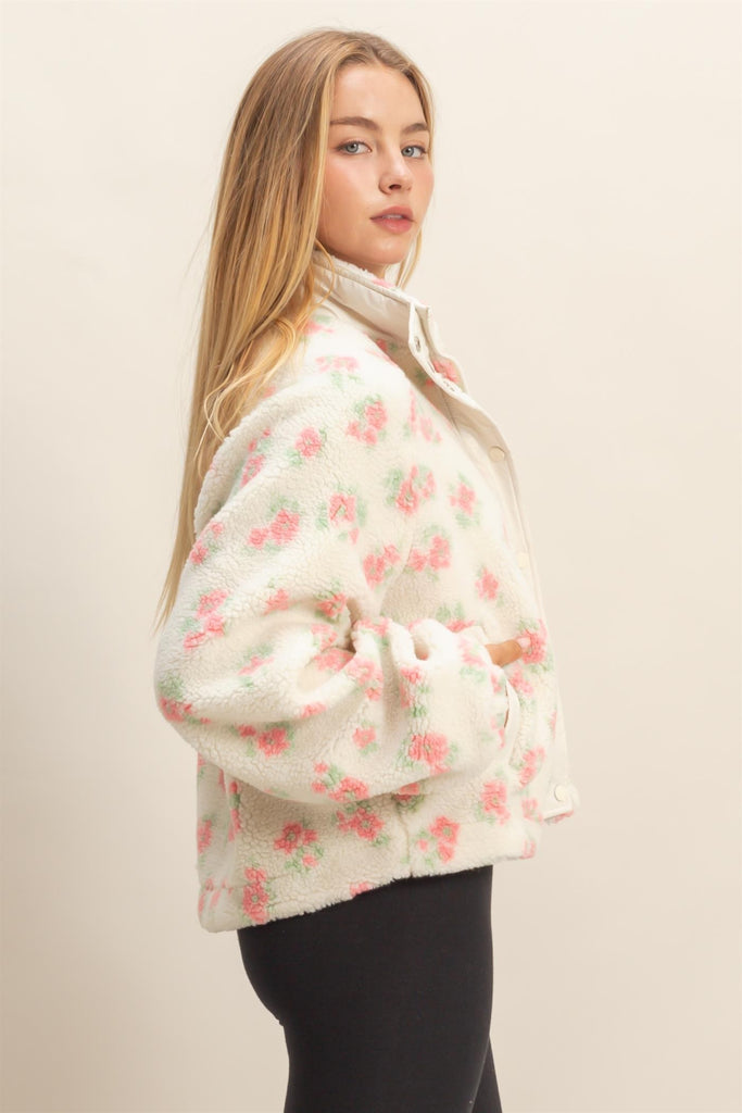 Wrap yourself in effortless comfort with The Floral Sherpa Bomber, where delicate floral patterns meet luxuriously soft sherpa fabric. This versatile layer features a smooth zip closure for easy on-and-off styling, making it perfect for layering over your favorite tees or dresses. The plush sherpa interior provides warmth without the bulk, while the charming floral design adds a touch of personality to any casual outfit. Whether you're running errands or relaxing at home, this bomber delivers the cozy embrace you've been craving.