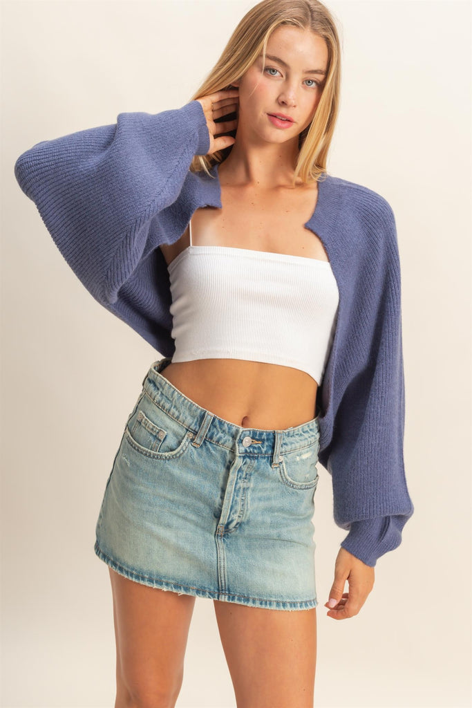 The Rose Shrug Cardigan in Dusty Navy is the perfect layering piece for effortless style. This cropped ribbed shrug drapes beautifully over any outfit, adding dimension and warmth without bulk. Crafted from soft, touchable fabric, it's designed to feel as good as it looks. Whether you're dressing up a simple tee or adding polish to an evening look, this versatile shrug transitions seamlessly from day to night. A wardrobe essential that works harder than you'd expect.