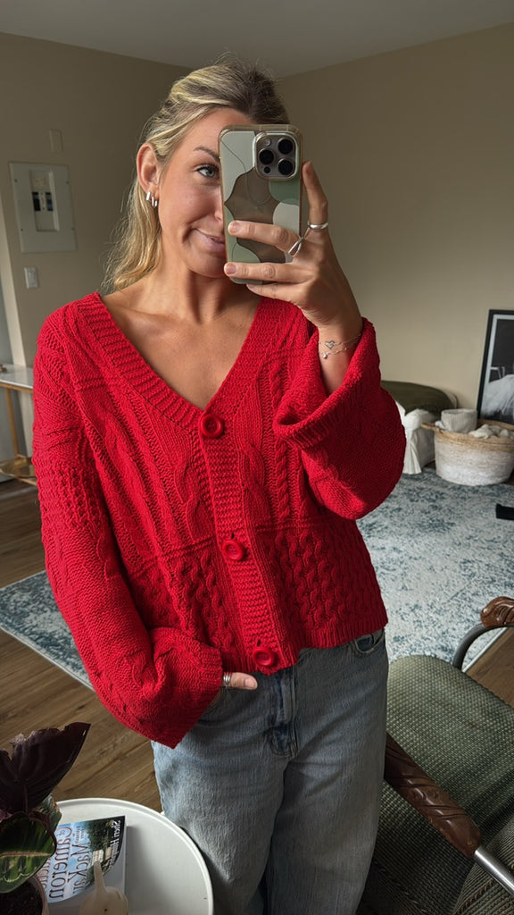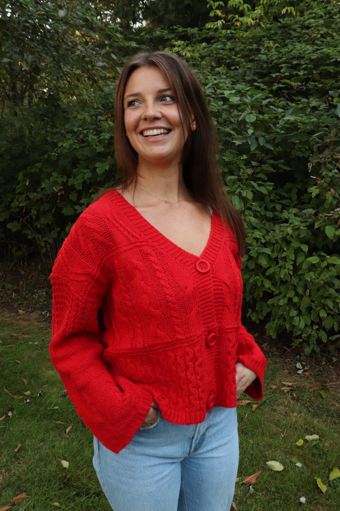 Elevate your cozy wardrobe with The Tessa Cardigan in vibrant red. Featuring a classic cable knit design and button-down front, this cardigan offers timeless style and easy layering. Made from a comfortable blend of acrylic and spandex, it fits true to size, available in Small/Medium and Medium/Large. Perfect for adding warmth without bulk, The Tessa Cardigan effortlessly complements any outfit while keeping you comfortably chic.