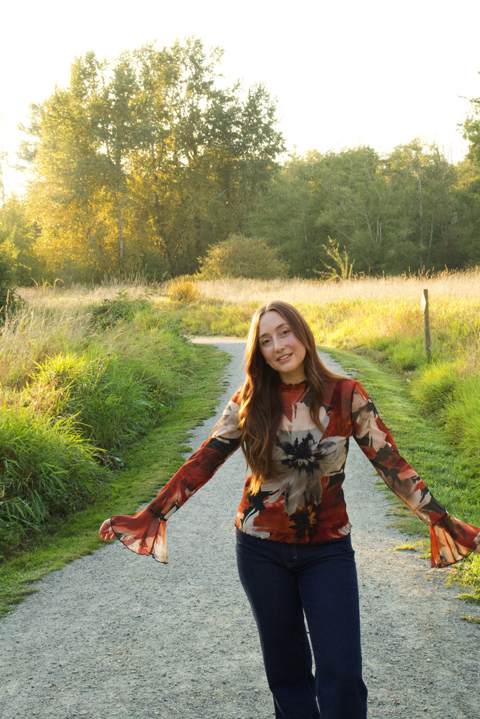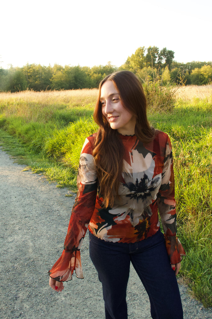 The Wren Floral Top combines delicate mesh with a fitted silhouette for a flattering, feminine look. Designed to be worn over a cami or bralette, it fits true to size and offers versatile styling options—perfect for casual days or dressing up for evenings out. Model wears a size small, highlighting its comfortable and figure-hugging fit that elevates any outfit effortlessly.